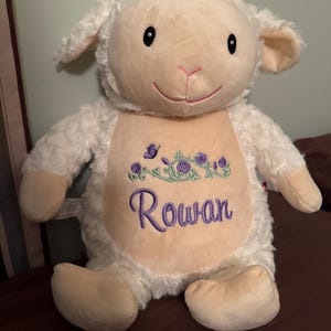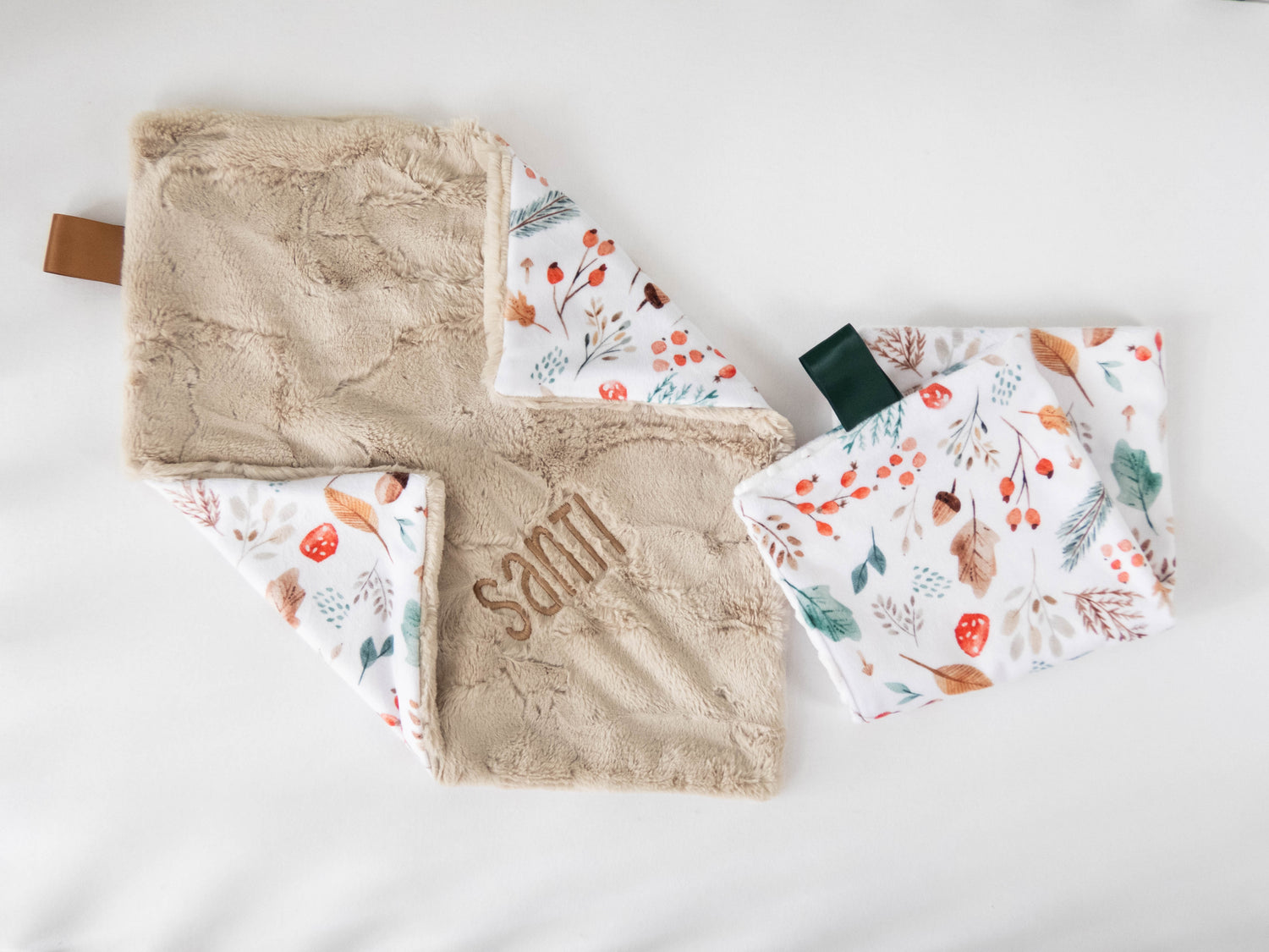 This handmade autumn forest lovey can be personalized with your child's name. Each name is custom embroidered during the process of making your personalized blanket. Both sides of the blanket are made of very soft minky, so no matter which side is used, baby will love the feel.