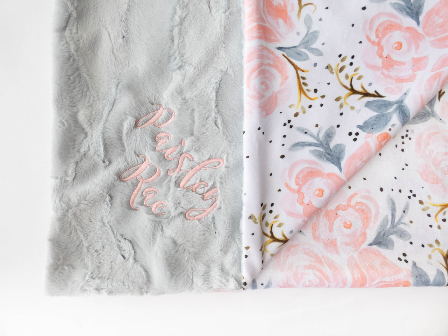 This handmade floral child blanket can be personalized with your baby girl's name. Each name is custom embroidered during the process of making your personalized blanket. Both sides of the blanket are made of very soft minky, so no matter which side is used, baby will love the feel.