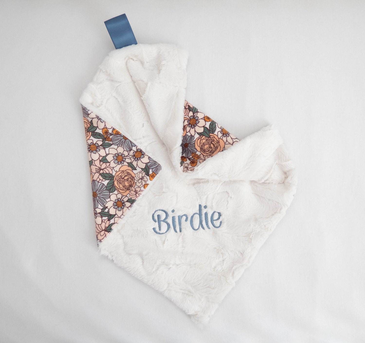 This handmade lovey can be personalized with your baby girl's name. Each name is custom embroidered during the process of making your personalized blanket. Both sides of the blanket are made of very soft minky, so no matter which side is used, baby will love the feel.