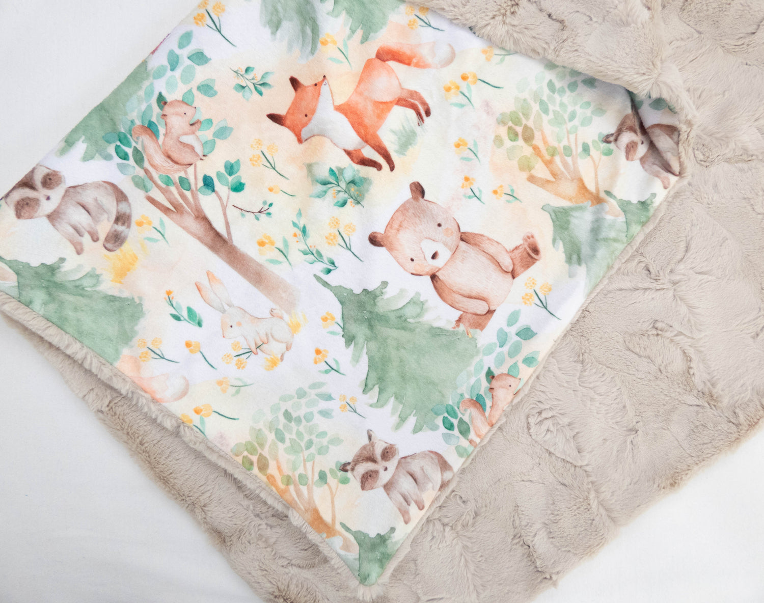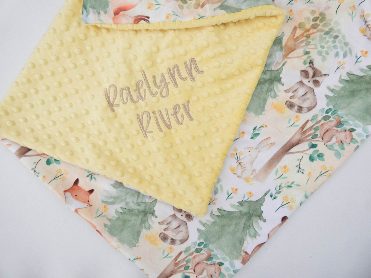 This handmade woodland baby blanket can be personalized with your baby boy's name. Each name is custom embroidered during the process of making your personalized blanket. Both sides of the blanket are made of very soft minky, so no matter which side is used, baby will love the feel.