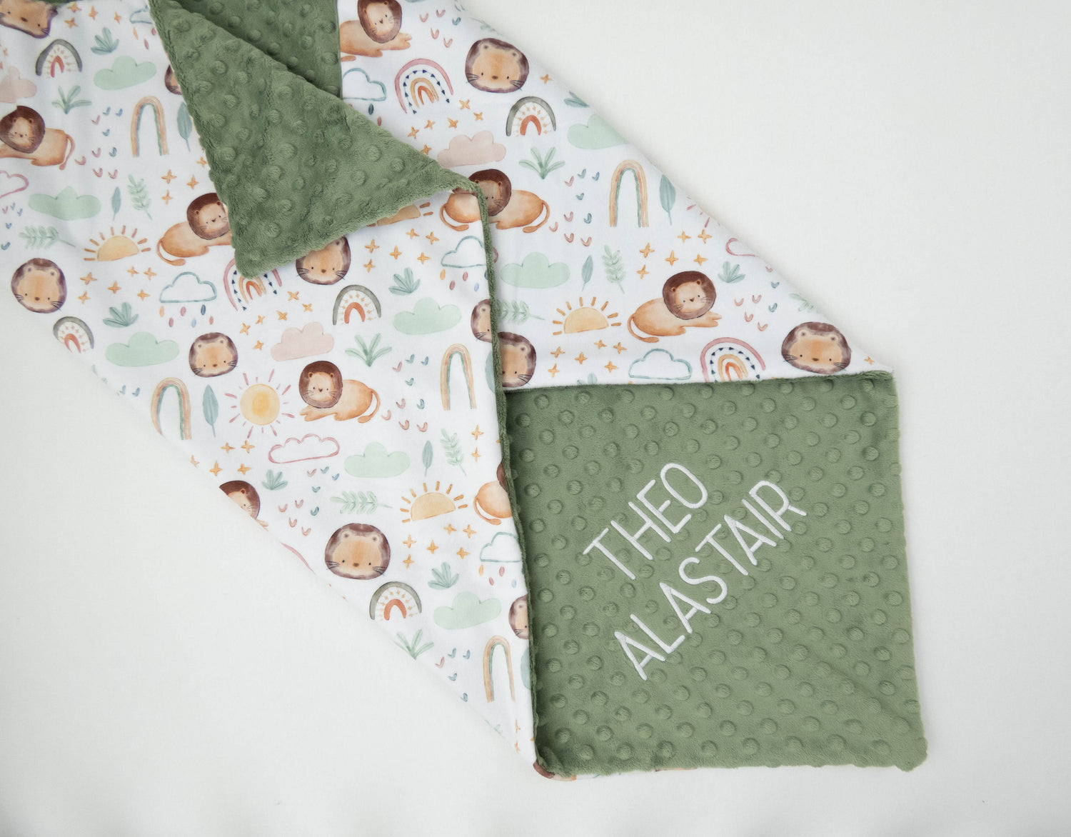 This handmade baby blanket features cute little lions, rainbows and sunshine. It can be personalized with your baby's name. Each name is custom embroidered during the process of making your personalized blanket. Both sides of the blanket are made of very soft minky, so no matter which side is used, baby will love the feel.