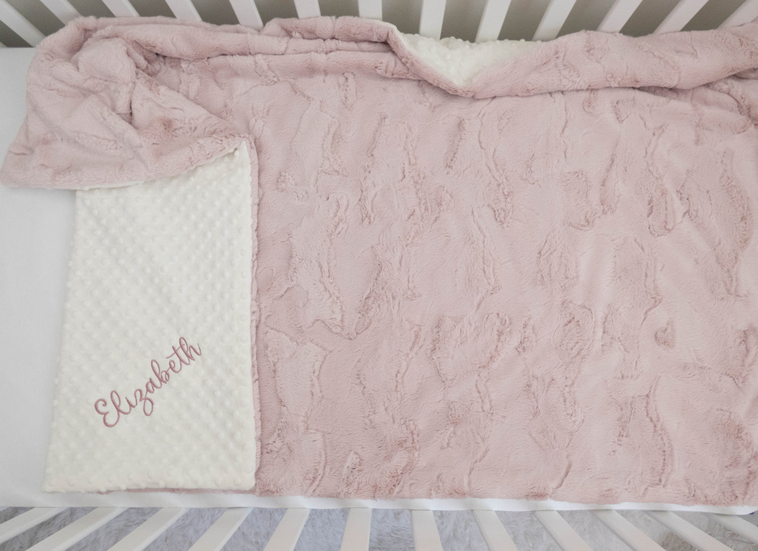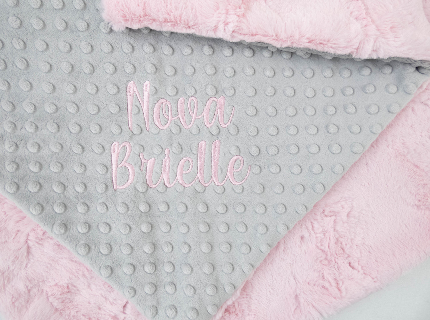 This handmade double minky baby lovey can be personalized with your child's name on the dimple dot side. Each name is custom embroidered during the process of making your personalized blanket. Both sides of the blanket are made of very soft minky, so no matter which side is used, baby will love the feel.