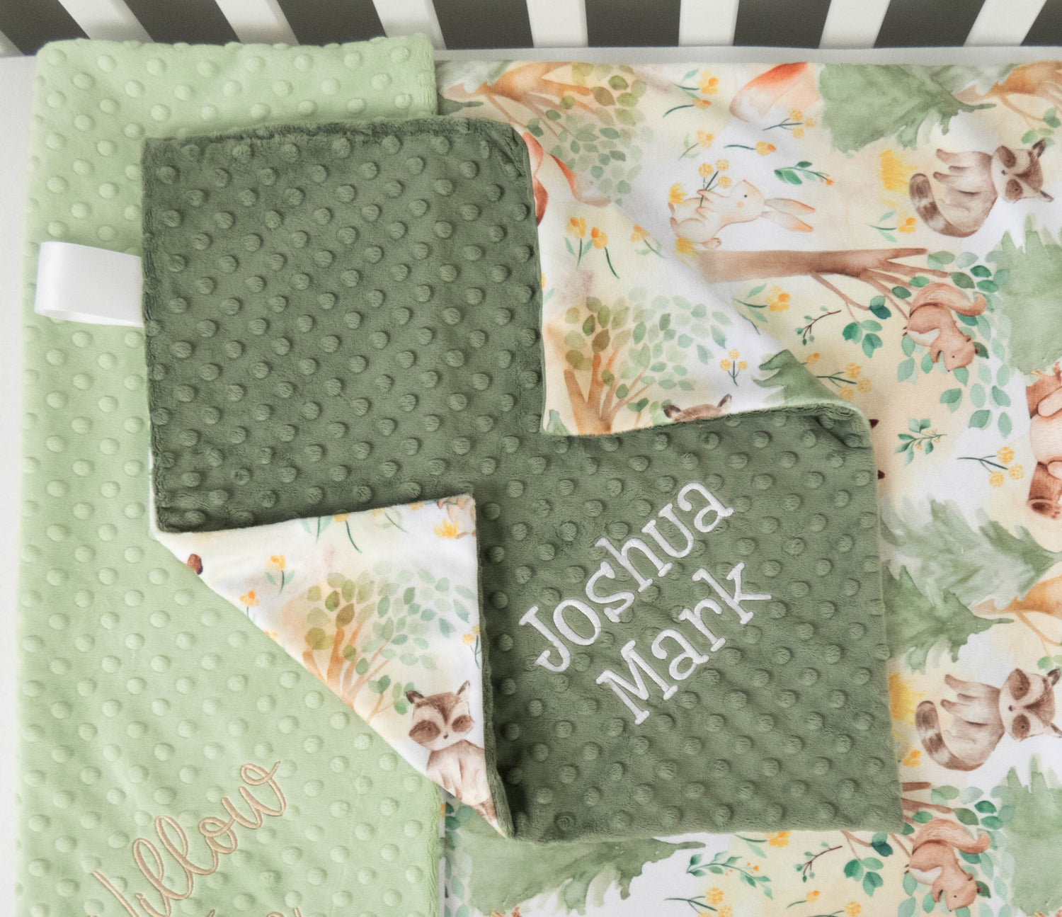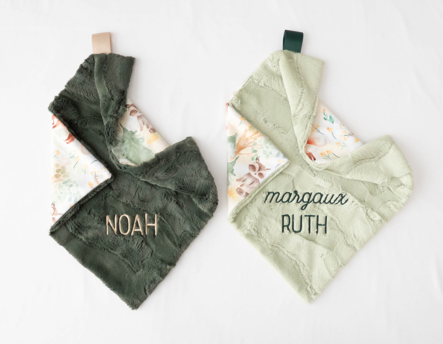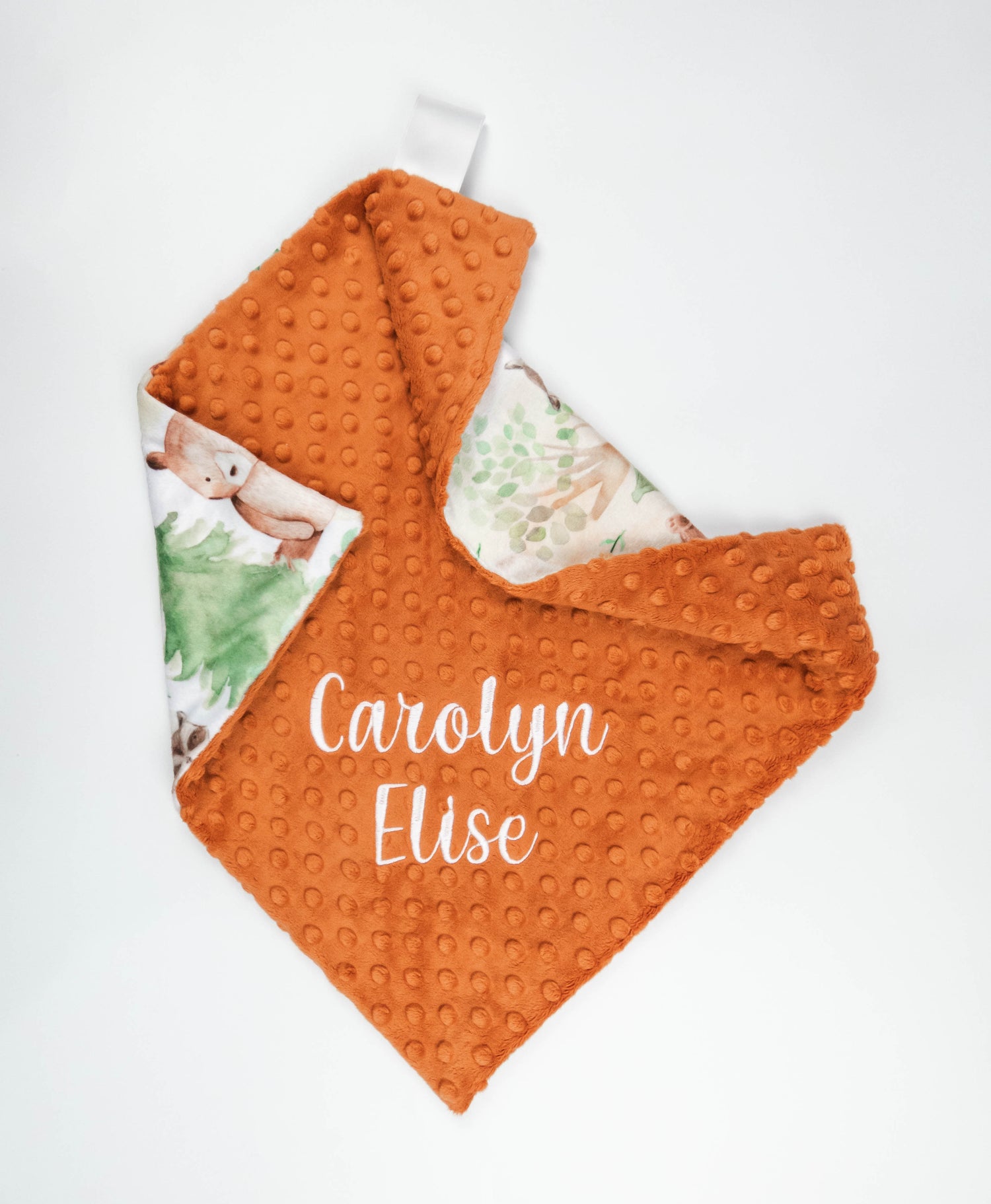 This handmade gender neutral lovey can be personalized with your baby's name. Each name is custom embroidered during the process of making your personalized blanket. Both sides of the blanket are made of very soft minky, so no matter which side is used, baby will love the feel.
